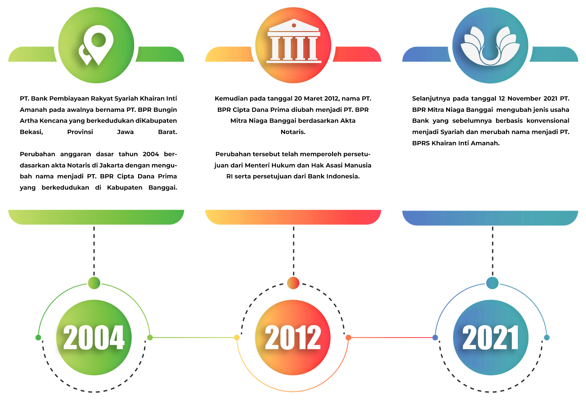 Sejarah PerusahaanPT.BPRS Khairan Inti Amanah Memahami sejarah perusahaan memberikan wawasan tentang bagaimana perusahaan mencapai posisi saat ini dan bagaiman keputusan serta peristiwa masa lalu membentuk strategi dan budaya perusahaannya. Perjalanan Kami